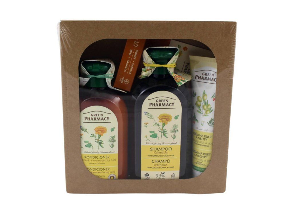 Darčekový set Green Pharmacy pre mastné vlasy robte radosť sebe alebo svojim blízkym perfektným kozmetickým setom Green Pharmacy pre mastné vlasy . Balíček plný vlasovej starostlivosti ako darček vždy poteší. Obsah sady: šampón pre mastné vlasy nechtík a rozmarínový olej 350 ml kondicionér pre mastné vlasy nechtík a rozmarínový olej 300 ml Krém na ruky a nechty olivový olej a goji 100ml Balzam na pery hydratačný med a vanilka 3,6g Vlastnosti: mix kozmetických produktov na každodenné použitie regulácia nadmerného mazu, regenerácia, výživa skvele sa hodí ako darček poteší všetky ženy a mužov Použitie: Každý produkt z kozmetického setu používajte podľa uvedeného návodu.Dodatočné parametre