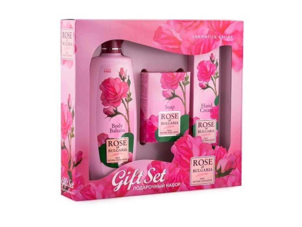 Darčekový set - telové mlieko, mydlo a krém na ruky z ruží Rose of Bulgaria Telové mlieko z ruží Telové mlieko na prírodnej báze obsahuje ružovú vodu s vysokým obsahom esenciálneho ružového oleja, ktorý má antialergické a zmäkčujúce účinky. Obsahuje vitamín E a extrakt z rozmarínu. Hydratuje a vyživuje pokožku tela, dodáva jej jemnosť a hebkosť. Mydlo z ruží Obsahuje palmový a kokosový olej bez konzervačných látok, s glycerínom. Obsahuje jemné peelingové častice sušených ružových lístkov bulharskej ruže „ROSA DAMASCENA“. Krém na ruky z ruží Obsahuje ružovú vodu s antibakteriálnymi a upokojujúcimi účinkami.Dodatočné parametre