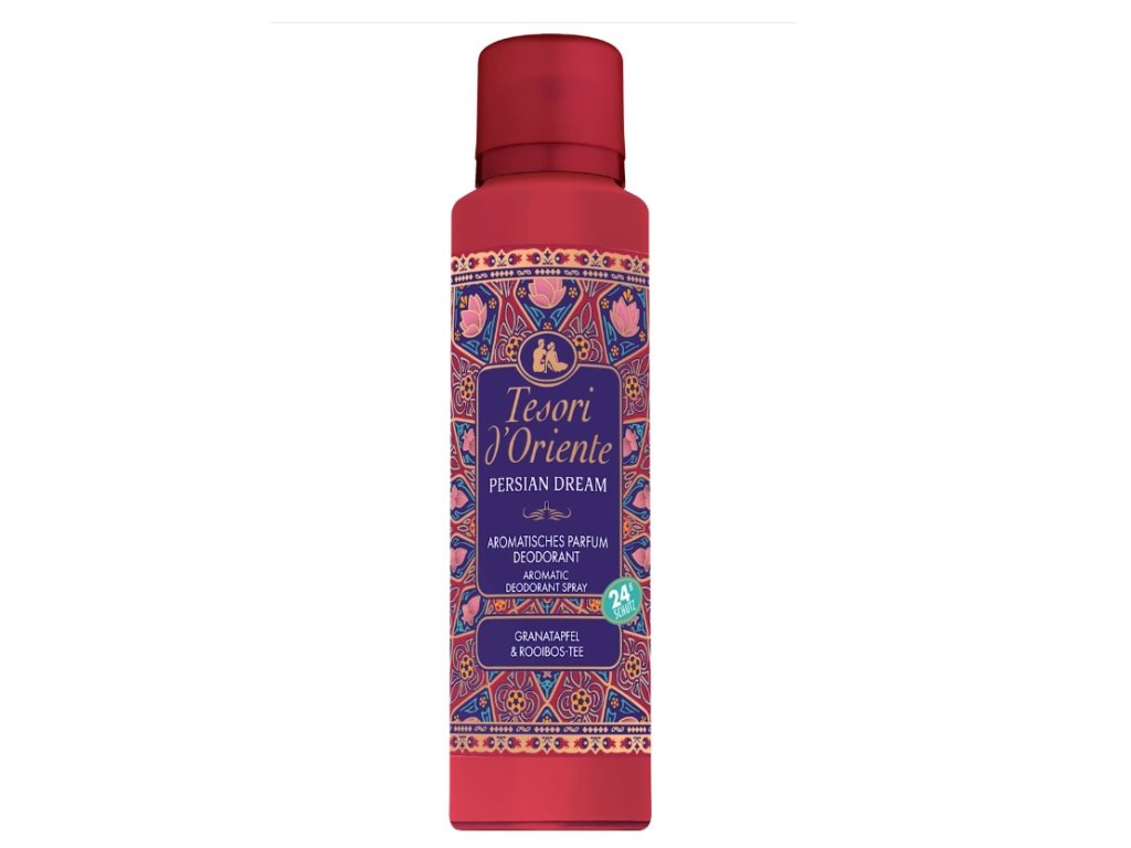 Aromatický dezodorant v spreji Persian Dream od Tesori D'Oriente ponúka príjemný pocit sviežosti. So zmyselnou ovocnou arómou granátového jablka a čaju rooibos môžete ľahko uniknúť z každodenného života. Deodorant dokáže poskytnúť až 24-hodinovú ochranu a bol dermatologicky testovaný. Ideálny pre váš každodenný wellness rituál – žiadne zvyšky na oblečení ani pokožke.