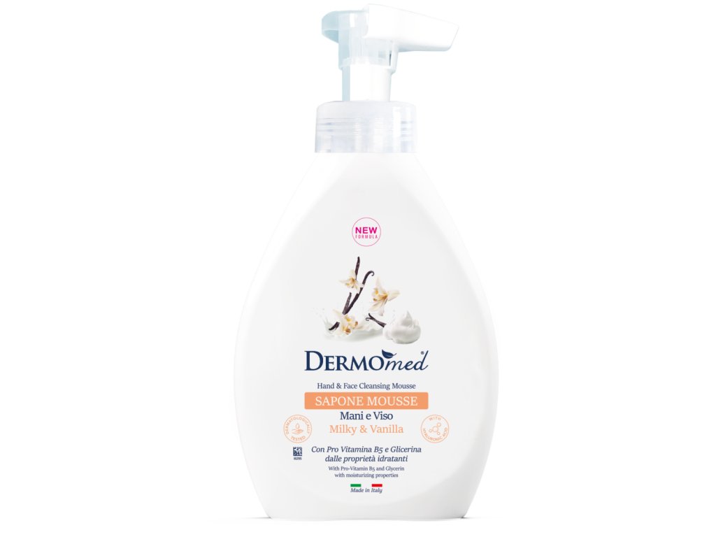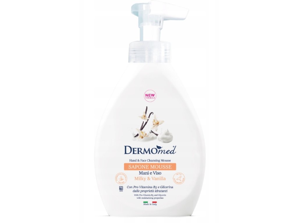 Jemná, penivá forma mydla DERMOMED robí umývanie rúk a tváre príjemne penivou penou čistým pôžitkom. Vôňa mlieka a vanilky umocňuje čuchový zážitok a spríjemňuje umývanie. Pena jemne čistí ruky a tvár a podporuje prirodzenú hydratáciu, udržuje pokožku hladkú a zamatovú. Zloženie mydla je obohatené o kyselinu hyalurónovú s elastickými vlastnosťami, provitamín B5 a glycerín s hydratačnými vlastnosťami.