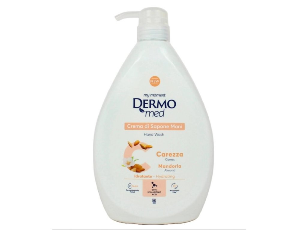 Nová formula mydla DERMOMED s kyselinou hyalurónovou a glycerínom poskytuje jemnú hydratáciu, vitalitu a sviežosť pokožky rúk. Jemne čistí aj tú najcitlivejšiu pokožku. Talianske mydlo má zmäkčujúci a výživný účinok, chráni a ošetruje pokožku a zanecháva ju zamatovo hladkú.
