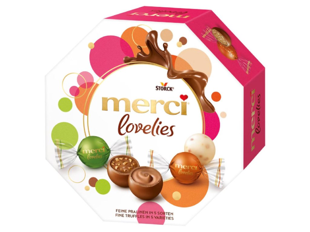 Dezert Merci Lovelies 185g Merci lovelies sú čokoládové guličky s neodolateľnou krémovou náplňou vytvorené tak, aby sa rozplývali na jazyku. Vychutnajte si tieto nezabudnuteľné okamihy potešenia so svojimi blízkymi a ľuďmi, ktorých máte radi. Päť jedinečných príchutí krémových praliniek v zamatovo jemnej čokoláde plnených delikátnym krémom, pre skutočne výnimočný pôžitok. Spoznajte teraz všetky rozmanité chute merci lovelies! Zloženie: Cukor, Kakaové maslo, Sušené plnotučné mlieko, Kakaová hmota, Rastlinný kokosový tuk, Lieskovce (4, 5 %), Mliečny tuk, Sušený cmar, Sušené odtučnené mlieko, Laktóza, Pšeničná múka, Sekané mandle (1, 1 %), Emulgátor: lecitíny (sója), Fruktóza, Arómy, Jedlá soľ, Kakaová sušina bielej čokolády najmenej 32 %, Kakaová sušina mliečnej čokolády najmenej 32 %, Kakaová sušina horkej čokolády najmenej 72 % Alergény: Obilniny, všetky druhy môžu tiež obsahovať stopy lieskovcov, mandlí, arašidov, iných orechov a vajec. Hmotnosť: 185g Výživové údaje na 100 g: Energetická hodnota [kJ]: 2504 Energetická hodnota [kcal]: 602 Tuky [g]: 43,1 z toho nasýtené mastné kyseliny [g]: 27,7 Sacharidy [g]: 44,5 z toho cukry [g]: 41,8 Bielkoviny [g]: 7,5 Soľ [g]: 0,29 Skladovanie: Skladujte v suchu, chráňte pred teplom a slnečným žiarením. Cena je za bal./185g