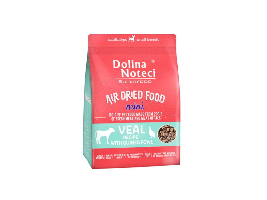 Dolina Noteci Superfood Air Dried Food Adult Mini Dog Veal & Guinea Fowl - je kompletné superpotravinové krmivo s 80% obsahom mäsa a vnútorností doplnené o funkčné prírodné ingrediencie na zabezpečenie zdravého života a ideálnej kondície Vašich psov malých plemien. Vyrobené je unikátnym spôsobom sušenia vzduchom pripomínajúcim skôr proces lyofilizácie ako extrudácie avšak so zachovaním dostatočnej vlhkosti pre ľahšiu stráviteľnosť. Táto jedinečná technológia umožňuje zachovanie vysokej nutričnej hodnoty surovín a zároveň mikrobiologickú nezávadnosť produktu. Výsledkom nie sú granule ale krokety, ktoré sú na povrchu chrumkavé, vo vnútri mäkké s vôňou a chuťou pripomínajúcou mokrú stravu.Dodatočné parametre