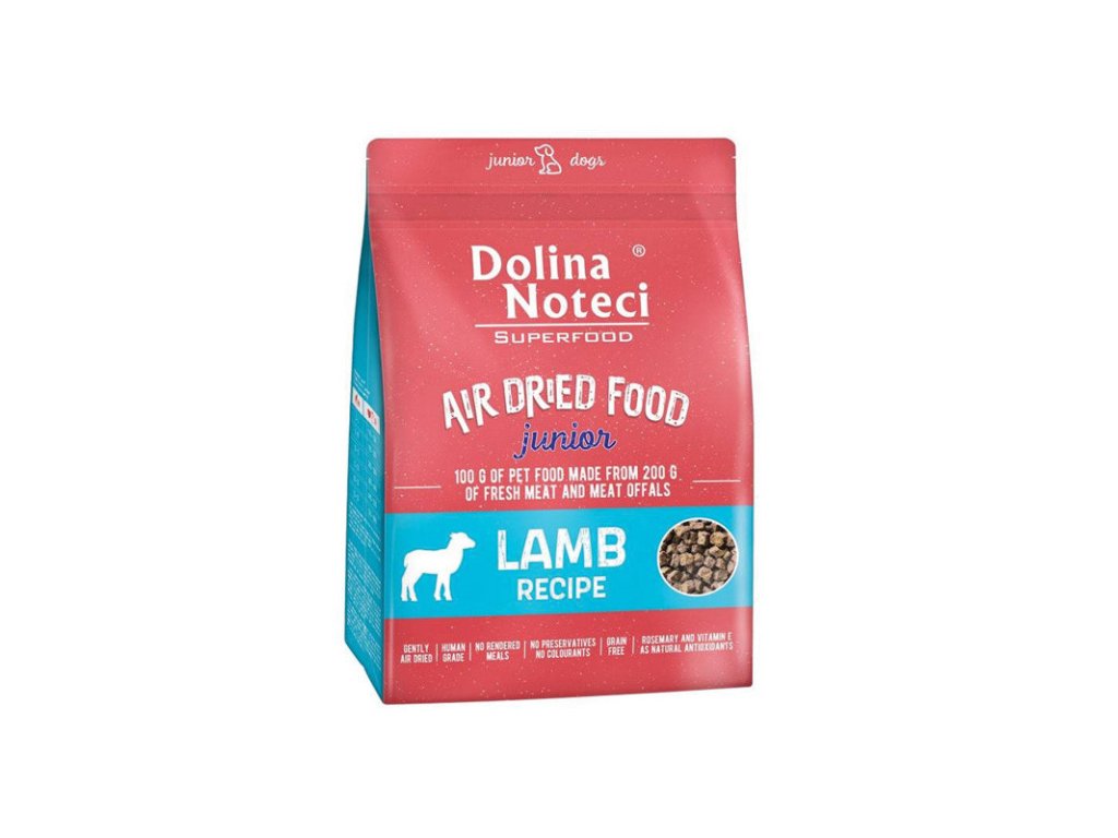 Dolina Noteci Superfood Air Dried Food Junior Lamb - je kompletné superpotravinové krmivo s 80% obsahom mäsa a vnútorností doplnené o funkčné prírodné ingrediencie na zabezpečenie zdravého vývinu šteniat a mladých psov všetkých plemien. Vyrobené je unikátnym spôsobom sušenia vzduchom pripomínajúcim skôr proces lyofilizácie ako extrudácie avšak so zachovaním dostatočnej vlhkosti pre ľahšiu stráviteľnosť. Táto jedinečná technológia umožňuje zachovanie vysokej nutričnej hodnoty surovín a zároveň mikrobiologickú nezávadnosť produktu. Výsledkom nie sú granule ale krokety, ktoré sú na povrchu chrumkavé, vo vnútri mäkké s vôňou a chuťou pripomínajúcou mokrú stravu.Dodatočné parametre