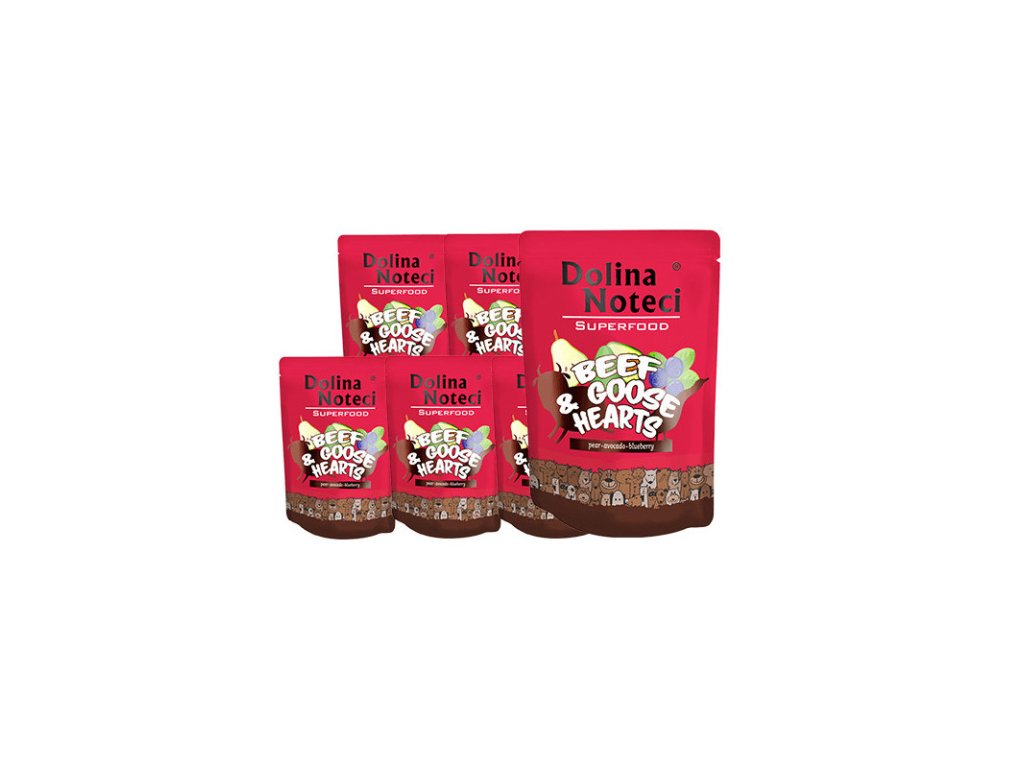 Dolina Noteci Superfood - Hovädzie a husacie srdcia s hruškou, avokádom a čučoriedkami je kompletná strava pre psov s obsahom 80% čerstvého mäsa a svaloviny z voľného chovu bez obsahu obilnín. Doplnené o ovocie, zeleninu a "superpotraviny" akými sú napr. morská riasa alebo mušle z Nového Zélandu.Dodatočné parametre