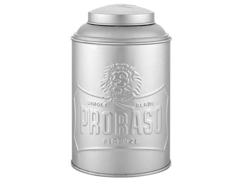 Vyvedená plechová dóza z dielne slávnej talianskej značky PRORASO, ktorá slúži ako dávkovač na púderu po holení. Celkový objem dózy vyrobené z matného hliníku je 600 ml.