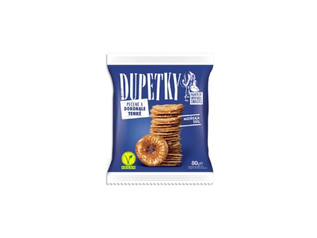 Dupetky s morskou soľou 80 g Dupetky sú pre každého milovníka slaného maškrtenia. Sú dokonale tenké, pečené pekne do chrumkava a navyše nezaťažujú vaše telo tak, ako vyprážané krekry. Ochutnajte ľahkosť Dupetiek s morskou soľou a dajte si ich napríklad k šalátu, syrom alebo len tak večer k televízii. pečené a nesmažené krekry Dupetky slané, dokonale tenké a chrumkavé chuťovky na zahryznutie, na cesty či pre návštevu príchuť: morská soľ s nízkym obsahom tuku bez umelých farbív, konzervantov Zloženie: Pšeničná múka, Rastlinné oleje (repkový, slnečnicový - v rôznych pomeroch), Cukor, Jačmenný sladový extrakt, Jedlá morská soľ 2, 8 %, Emulgátor: sójový lecitín, Kypriaca látka: uhličitany sodné, Antioxidant: extrakty z rozmarínu Alergény: Môže obsahovať sezam a horčicu. Výživové hodnoty na 100g: Energia: 1753 kJ/ 416 kcal Tuky: 9,2 g z toho nasýtené mastné kyseliny: 0,8 g Sacharidy: 72 g z toho cukry: 6,6 g Bielkoviny: 9 g Soľ: 2,8 g Skladovanie: Skladujte v suchu, chráňte pred teplom a priamym slnečným žiarením. Cena je za bal./80g