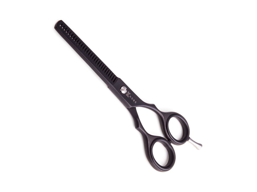 Barber prestrihávacie nožnice KOBE Night black s dĺžkou 5,5 palca (14 cm) v elegantnom matnom čiernom dizajne. Sú vyrobené z vysokokvalitnej kalenej ocele s 28 zubami, ktoré ponúkajú vynikajúci všestranný efilingový výkon s hladkým strihom.