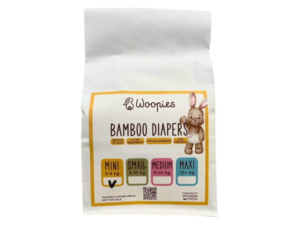 Táto vzorka obsahuje 3 ks plienok Woopies MINI (3–8 kg), takže je ideálna najmä na otestovanie strihu, savosti a komfortu.