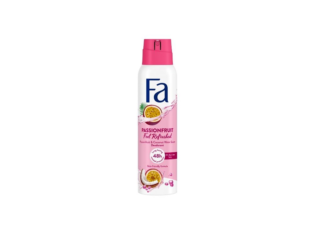 Fa Passionfruit je dezodorant 150ml v aerosolovom spreji s výnimočnou kombináciou vône marakuje a kokosovej vody, ktorý prináša dlhodobú sviežosť a komfort pre každodenné použitie. Až 48 hodinová ochrana pred nepríjemným telesným pachom. Formulácia bez hliníkových solí – jemná k pokožke. Dermatologicky testované zloženie, vhodné pre citlivejšiu pokožku.Dodatočné parametre