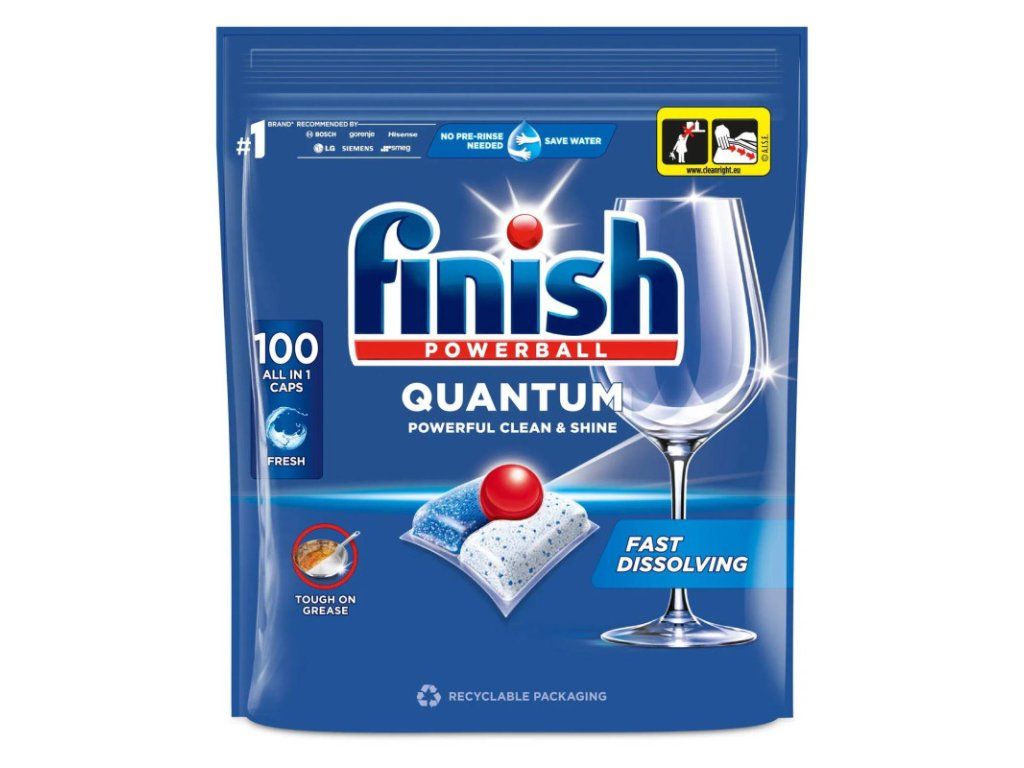 Finish Quantum All In One kapsule do umývačky riadu 100 ks Finish Quantum All in 1 dopraje vášmu riadu žiarivý lesk a čistotu hneď na prvýkrát. Trojkomorové zloženie účinne odstráni všetky druhy nečistôt pochádzajúcich od jedla, a to aj bez predumývania. *Finish je najviac predávanou značkou v kategórii Automatického umývania riadu na základe hodnoty predaja v EÚ. Kľúčové vlastnosti: Diamantový lesk - už po prvom umytí bude váš riad žiariť oslnivým leskom Všetky druhy nečistôt bez predumývania - efektívne proti všetkým druhom nečistôt aj bez predumývania Recyklovateľné - obal kapsúl Finish Quantum All in 1 je biologicky rozložiteľný a 100 % rozpustný vo vode. Použitie: Zvyšky nečistôt zoškrabte pred naplnením umývačky do odpadkového koša Kapsulu vyberte suchými rukami a vložte do zásobníka vašej umývačky Nerozbaľujte ju, ani nerozdeľujte. Nevkladajte produkt do košíka na príbor Zásobník uzavrite a vyberte vhodný program na umývanie, najlepšie výsledky dosiahnete pri teplote 50/55 °C alebo na automatický program Pre najlepšie výsledky použite aj Finish leštidlo a soľ Bezpečnosť a skladovanie: Uchovávajte mimo dosahu detí. Skladujte v suchom prostredí, mimo dosahu tepla a vlhkosti. Vhodné do všetkých umývačiek riadu. Recyklujte prázdny obal. Zloženie: Bieliace činidlá na báze kyslíka. 5 % alebo viac, ale menej ako 15 % bieliace činidlá na báze kyslíka. Polykarboxyláty, fosfonáty, variant Regular ďalej obsahuje enzýmy (subtilizín, amylasa), parfum (Benzylbenzoate, Geraniol). Variant Lemon ďalej obsahuje: enzýmy (subtilizín, amylasa), parfum (Limonene). Cena je za bal./100 ksDodatočné parametre
