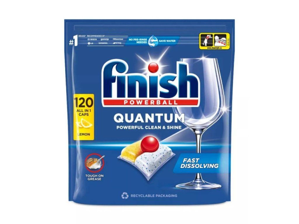 Finish Quantum All In One Lemon kapsule do umývačky riadu 120 ks Finish Quantum All in 1 Lemon dopraje vášmu riadu žiarivý lesk a čistotu hneď na prvýkrát. Trojkomorové zloženie účinne odstráni všetky druhy nečistôt pochádzajúcich od jedla, a to aj bez predumývania. *Finish je najviac predávanou značkou v kategórii Automatického umývania riadu na základe hodnoty predaja v EÚ. Kľúčové vlastnosti: Diamantový lesk - už po prvom umytí bude váš riad žiariť oslnivým leskom Všetky druhy nečistôt bez predumývania - efektívne proti všetkým druhom nečistôt aj bez predumývania Recyklovateľné - obal kapsúl Finish Quantum All in 1 je biologicky rozložiteľný a 100 % rozpustný vo vode. Prijemná citrusová vôňa Použitie: Zvyšky nečistôt zoškrabte pred naplnením umývačky do odpadkového koša Kapsulu vyberte suchými rukami a vložte do zásobníka vašej umývačky Nerozbaľujte ju, ani nerozdeľujte. Nevkladajte produkt do košíka na príbor Zásobník uzavrite a vyberte vhodný program na umývanie, najlepšie výsledky dosiahnete pri teplote 50/55 °C alebo na automatický program Pre najlepšie výsledky použite aj Finish leštidlo a soľ Bezpečnosť a skladovanie: Uchovávajte mimo dosahu detí. Skladujte v suchom prostredí, mimo dosahu tepla a vlhkosti. Vhodné do všetkých umývačiek riadu. Recyklujte prázdny obal. Zloženie: Bieliace činidlá na báze kyslíka. 5 % alebo viac, ale menej ako 15 % bieliace činidlá na báze kyslíka. Polykarboxyláty, fosfonáty, variant Regular ďalej obsahuje enzýmy (subtilizín, amylasa), parfum (Benzylbenzoate, Geraniol). Variant Lemon ďalej obsahuje: enzýmy (subtilizín, amylasa), parfum (Limonene). Cena je za bal./120 ksDodatočné parametre
