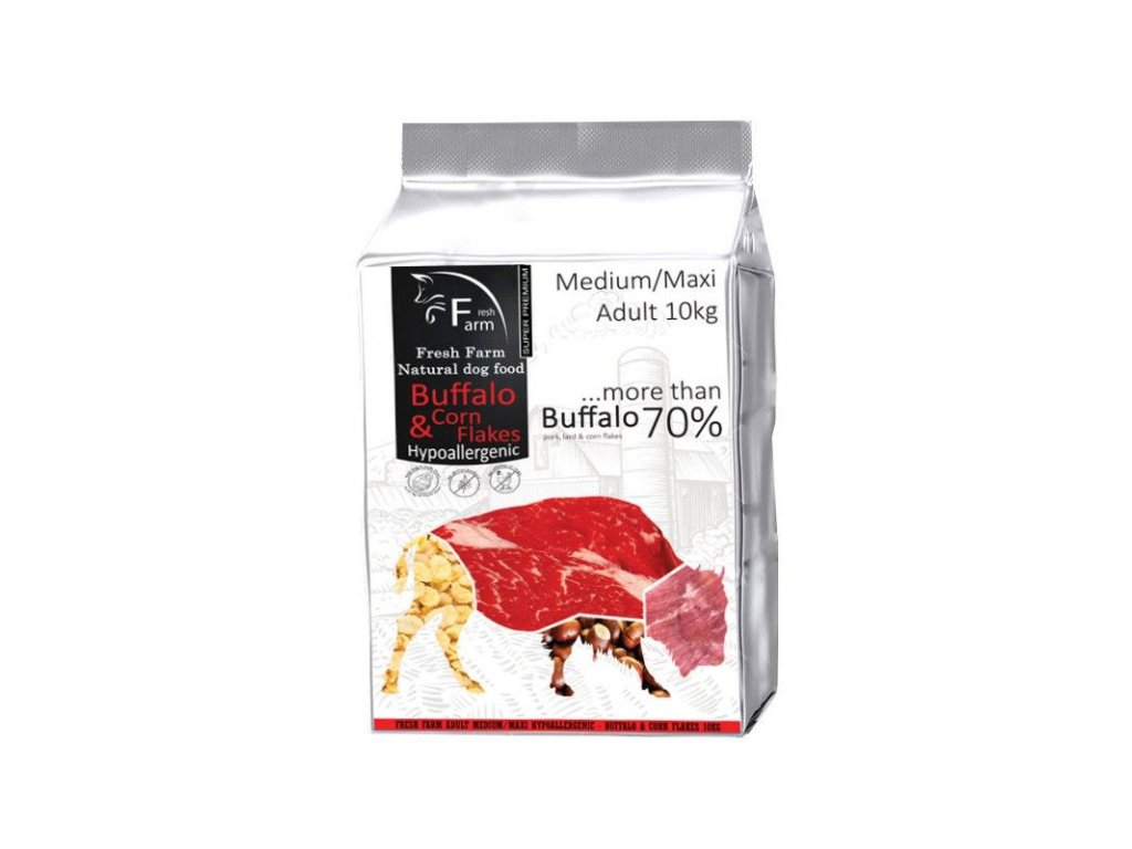 Fresh Farm Adult Medium&Maxi Intolerance - Buffalo & Cornflakes je kompletné superprémiové krmivo určené pre dospelých psov stredných a veľkých plemien. S obsahom unikátneho druhu živočíšnych bielkovín (byvol z talianskej farmy), jediného druhu tuku (bravčová masť) a dvakrát prevarených ľahko stráviteľných vločiek je mimoriadne vhodné pre psov s potravinovou alergiou a psov s tráviacimi problémami.Dodatočné parametre