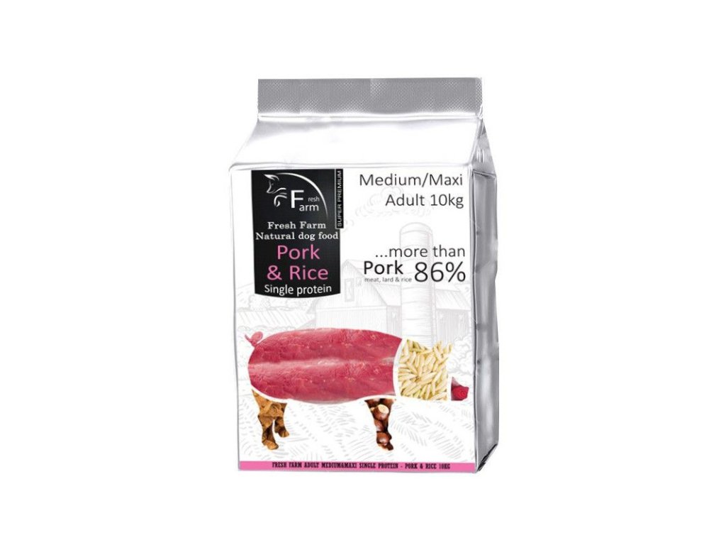Fresh Farm Adult Medium&Maxi Single Protein - Pork & Rice je kompletné monoproteínové superprémiové krmivo určené pre dospelých psov stredných a veľkých plemien. S vysokým obsahom bravčového mäsa a bravčových oškvarkou je dobrou voľbou pri potravinovej intolerancii a tráviacich problémoch psa.Dodatočné parametre