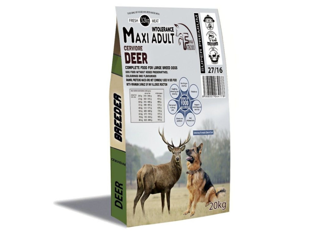 Fresh Farm Deer Adult Medium&Maxi Intolerance je kompletné superprémiové krmivo určené pre dospelých psov stredných a veľkých plemien. S obsahom unikátneho druhu živočíšnych bielkovín (jeleň z talianskej farmy), jediného druhu tuku (bravčová masť) a jediný druh uhľohydrátov (ryža) je mimoriadne vhodné pre psov s potravinovou alergiou a psov s tráviacimi problémami.Dodatočné parametre