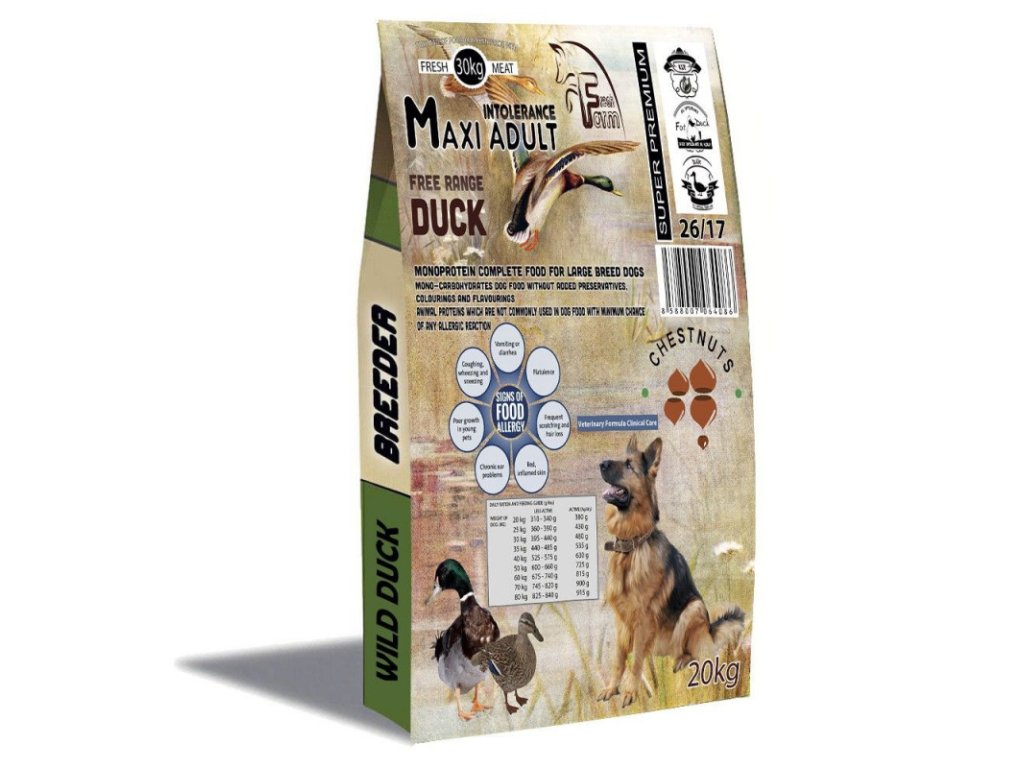 Fresh Farm Duck Adult Medium&Maxi Intolerance je kompletné monoproteínové superprémiové krmivo určené pre dospelých psov stredných a veľkých plemien. S obsahom jediného druhu živočíšnych bielkovín (kačica), jedného druhu tuku (kačací tuk) a jedného druhu uhľohydrátov (ryža) je mimoriadne vhodné pre psov s potravinovou alergiou a psov s tráviacími problémami.Dodatočné parametre