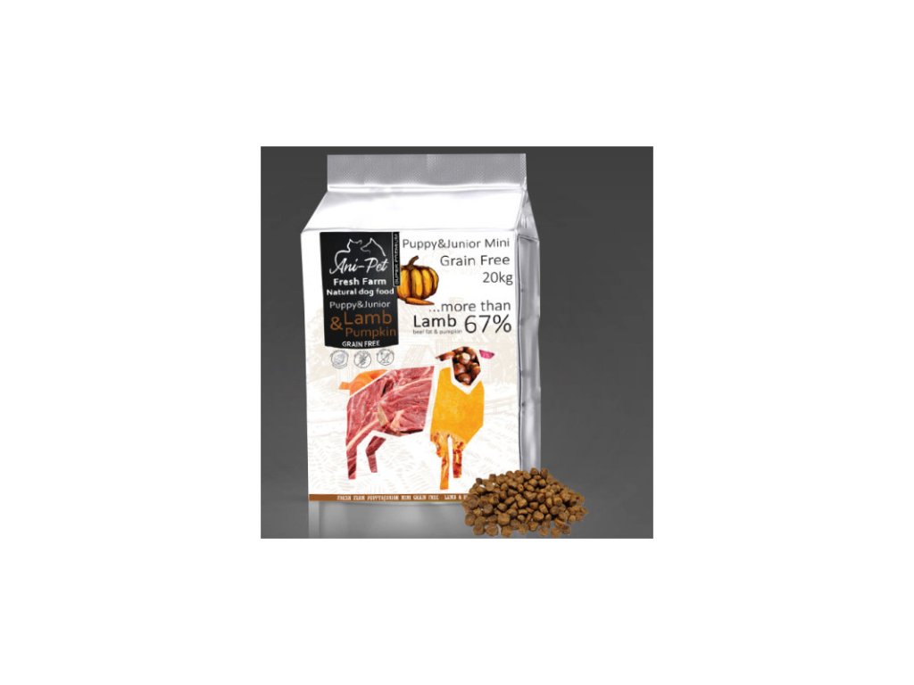 Ani - pet Fresh Farm GF Natural Dog Food Puppy&Junior Mini - Lamb & Pumpkin je kompletné monoproteínové krmivo pre šteňatá psov malých a trpaslíčich plemien do 1 roku života. Receptúra bez obilnín s obsahom čerstvého jahňacieho mäsa.Dodatočné parametre
