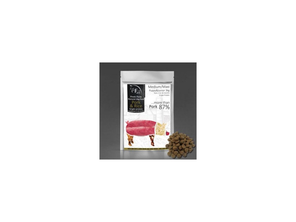 Fresh Farm Puppy&Junior Single Protein Medium&Maxi - Pork & Rice je kompletné bezlepkové krmivo pre šteňatá a mladých psov od 2. do 16. mesiaca života. Určené pre stredné a veľké plemená psov nad 10kg s obsahom jediného živočíšneho proteínu (bravčové) chovaného na talianskych farmách.Dodatočné parametre