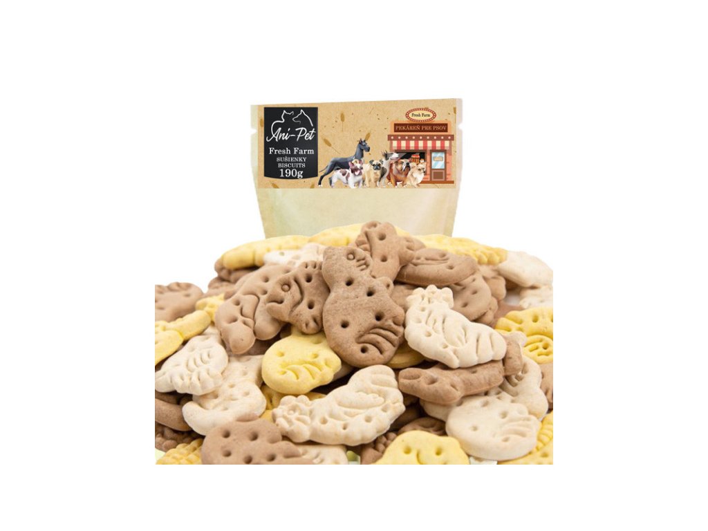 Fresh Farm Sušienky - Mini Zoo Mix je zdravý pamlsok ideálny ako odmena pre poslušné psov všetkých plemien. Hlavné vlastnosti: - bez živočíšnych bielkovín - bohaté na vitamíny A a D - s pridanými minerálnymi látkami - bez pridaného cukru - ľahkostráviteľné - bez GMO surovín - bez farbív.Dodatočné parametre