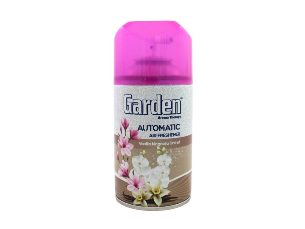 Garden náhrada do osviežovača 260ml Vanilla Magnolia Orchid Osviežovač vzduchu určený do automatických dávkovačov Kompatibilný s automatickými dávkovačmi : -  TORK a AIR WICK Možnosť použitia aj samostatne bez dávkovača Založený na suchej technológii (nevytvára „mokrú hmlu“). Vytvára príjemnú atmosféru Bežná výdrž náplne 60 dní Objem: 260 ml  Vôňa: Vanilla Magnolia Orchid/vanilka, magnólia a orchidea Sladká vôňa vanilky, magnólie a orchidei vykúzli vo vašom interiéri atmosféru pohody. Cena za bal./260ml