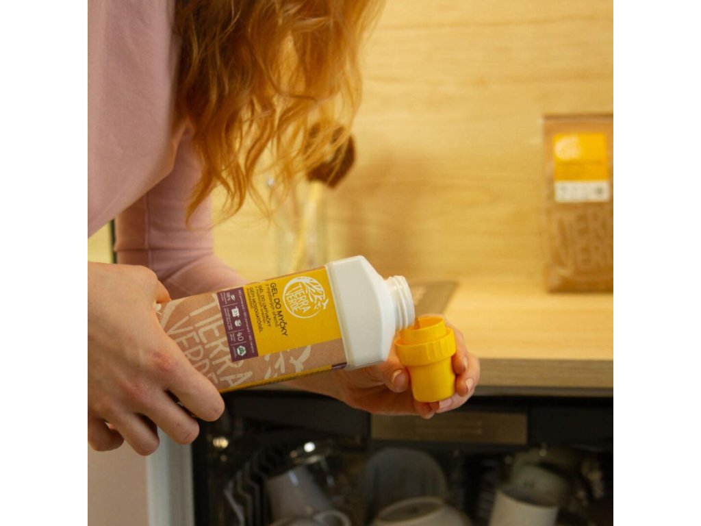 Gél do umývačky riadu z mydlových orechov s BIO pomarančovou silicou (fľaša) Tierra Verde 1l Gél do umývačky riadu so zvýšeným obsahom extraktu z mydlových orechov účinne odstraňuje nečistoty. Skvele sme ho vylepšili. V novom zložení sme použili prírodný tenzid, ktorý výborne odmasťuje a jedlá sóda prispieva k odstráneniu zaschnutých zvyškov jedla. Gél je nedráždivý a šetrný k prírodnému prostrediu. Jemne vonia vďaka pridanej BIO pomarančovej silici. Vlastnosti gélu: Prírodné zloženie: Vyrobený z mydlových orechov, sódy bikarbóny a rastlinných tenzidov. Neobsahuje ropné deriváty, fosfonáty, chlór, enzýmy, optické rozjasňovače, syntetické parfumy ani farbivá. Vysoká účinnosť: Dokonale odstraňuje nečistoty a mastnotu z riadu a zároveň ho chráni pred poškriabaním. Jemná vôňa: Gél je jemne parfumovaný prírodnou BIO pomarančovou silicou, ktorá dodáva riadu sviežu vôňu. Vhodný pre všetky typy umývačiek: Gél je vhodný pre všetky typy umývačiek riadu a je účinný už pri 40°C. Ekologický obal: Fľaša je vyrobená z recyklovaného plastu a je 100% recyklovateľná. Výhody používania gélu: Chráni životné prostredie: Gél je biologicky rozložiteľný a nezaťažuje životné prostredie. Šetrný k pokožke: Gél je hypoalergénny a nedráždi pokožku. Vhodný pre vegánov: Gél neobsahuje žiadne živočíšne zložky. Použitie: Do zásobníka umývačky nalejte 25 ml prípravku (asi 3/4 uzáveru fľaše). Pri silne znečistenom riade: Dávkujte celý uzáver fľaše. Pridajte lyžicu Odstraňovača vodného kameňa – kyseliny citrónovej, ktorá zbaví umývačku vodného kameňa. Účinky gélu zosilní aj Bika – jedlá sóda, ktorá zbaví umývačku aj prípadného zápachu. Dodatok: Suroviny pre našu drogériu volíme tak, aby predstavovali čo najmenšiu záťaž pre zdravie ľudí aj planéty. Netestujeme na zvieratách.Výrobok neobsahuje ropné deriváty, fosfonáty, chlór, enzýmy, optické rozjasňovače, syntetické parfumy ani farbivá.Dodatočné parametre
