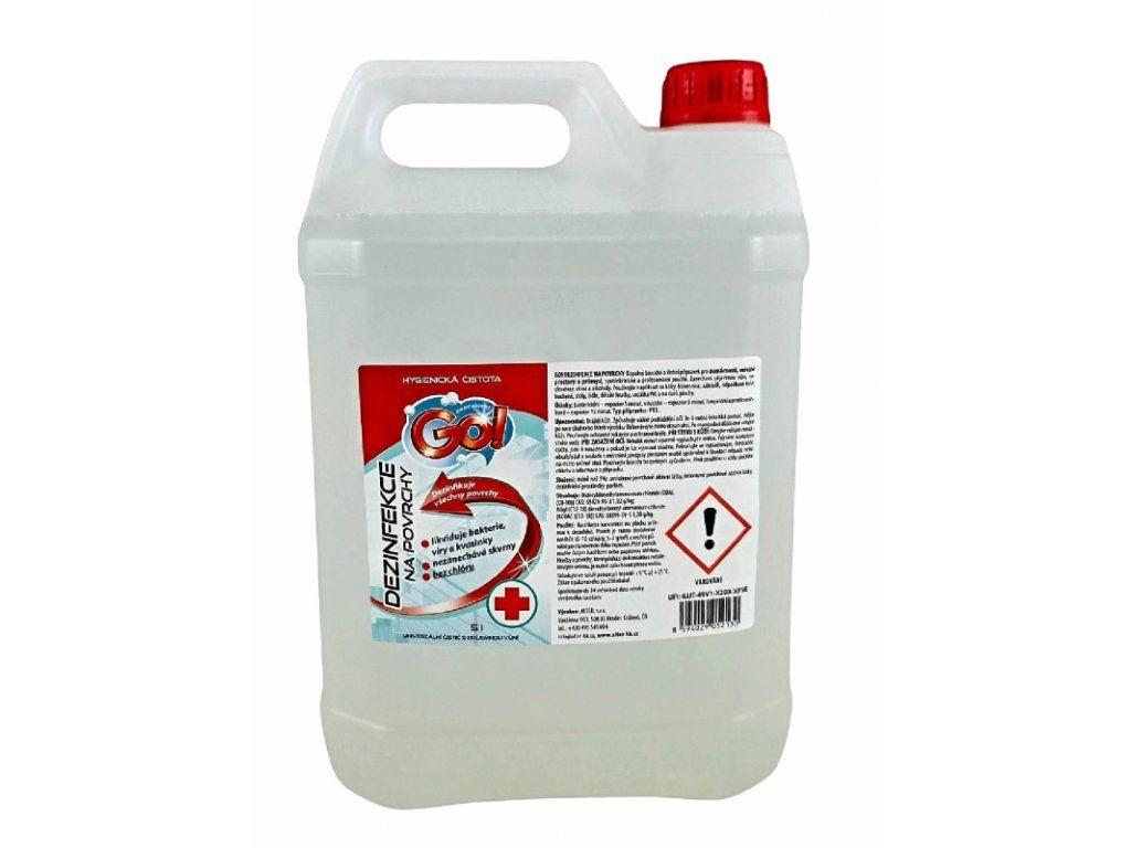 GO! DEZINFEKCIA NA POVRCHY 5L Kvapalný biocídny a čistiaci prípravok pre domácnosti, verejné priestory a priemysel, spotrebiteľské a profesionálne použitie. Zanecháva príjemnú vôňu, neobsahuje chlór a alkoholy. Použitie: Na kľučky, klávesnice, zábradlia, odpadkové koše, kuchyne, stoly, stoličky, detské hračky, sedadlá WC a na ďalšie plochy. Baktericídne – pôsobenie 5 minút Virucídne – pôsobenie 5 minút Fungicídne a proti kvasinkové – pôsobenie 15 minút Typ prípravku: PT2 Dráždi kožu. Spôsobuje vážne podráždenie očí. Pokyny pre bezpečné zaobchádzanie: Ak je potrebná lekárska pomoc, majte po ruke obal alebo štítok výrobku. Uchovávajte mimo dosahu detí. Po manipulácii dôkladne umyte kožu. Používajte ochranné rukavice a ochranné okuliare. PRI STYKU S KOŽOU: Umyte veľkým množstvom vody. PRI ZASIAHNUTÍ OČÍ: Niekoľko minút opatrne vyplachujte vodou. Vyberte kontaktné šošovky, ak sú nasadené a pokiaľ ich možno vybrať ľahko. Pokračujte vo vyplachovaní. Odstráňte obsah/obal v súlade s miestnymi predpismi odovzdaním osobe oprávnenej na likvidáciu odpadov alebo na miesto určené obcou. Nebezpečné látky: Didecyldimetylamonium chloride (DDAC (C8-10)), Quaternary ammonium compounds, benzyl C12-C16 (even numbered) - alkyldimetyl chlorides Zloženie: menej ako 5%: amfotérne povrchovo aktívne látky, neiónové povrchovo aktívne látky, dezinfekčné prostriedky, parfum. Používajte biocídy bezpečným spôsobom. Pred použitím si vždy prečítajte označenie a informácie o prípravku. Cena je za bal./5LDodatočné parametre