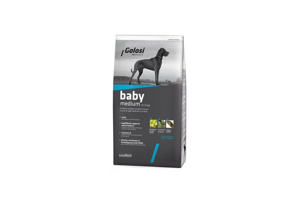 Golosi Baby Médium . kuracie s ryžou je kompletné krmivo pre šteňatá stredných plemien.Dodatočné parametre