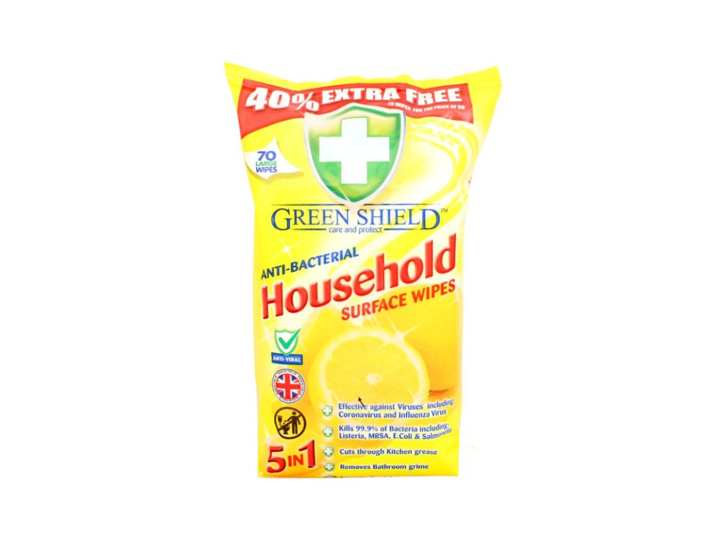 Green Shield vlhčené utierky na povrchy 5v1 antibacterial Citrón 70 ks Antibakteriálne vlhčené obrúsky určené na všetky umývateľné povrchy v domácnosti alebo aj mimo domácnosti. Zabíja 99,9% baktérií a vírusov. Sú skvelé na mastnotu v kuchyni alebo nečistoty v kúpeľni. Balenie obsahuje 70 obrúskov. V súčasnej situácii obrúsky odporúčame používať na dezinfekciu povrchov: madlá nákupných košíkov, tlačidlá výťahu a iných povrchov kde si nie ste istí históriou povrchu. Cena je za 1bal./70ks
