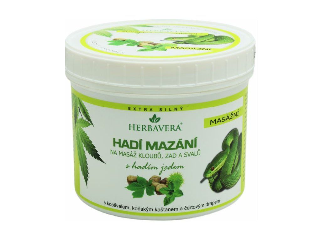 Hadie mazanie so syntetickým jedom štrkáča, kanabisom a gaštanom.Masáž hadím mazaním má výborné účinky na uvoľnenie pohybového ústrojenstva.Syntetický hadí jed obsahuje peptidy podobné Waglerinu, zložky jedu hada štrkáč, ktorý masážou uvoľňuje svalové tenzie, urýchľuje regeneráciu a zlepšuje výkon.Masáž s účinkom gaštanu konského, kostihoja, 9 tajných bylín a konope je pravým potešením pre unavené telo.Používa sa pred alebo v priebehu športového výkonu.Masáž balzamom je dobrým pomocníkom pri problémoch s bolesťou chrbta, šliach, svalov, lokálnych opuchoch a pôsobí aj preventívne na dlhotrvajúce problémy s pohybovým aparátom.Dodatočné parametre
