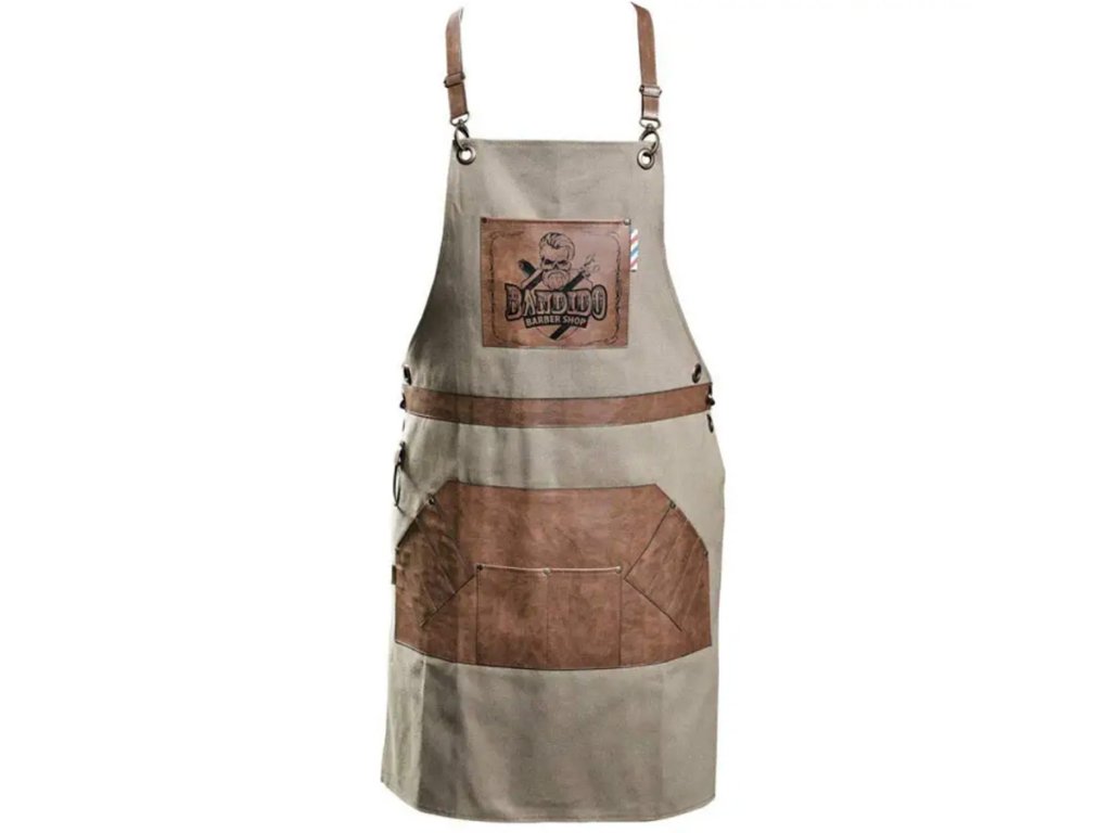 Kvalitná holičská zástera BANDIDO vo vojenskej farbe s množstvom kožených vreciek na uloženie nožníc, hrebeňov a iných holičských potrieb. Materiál zástery dokonale odpudzuje vodu. Zapínanie je riešené pomocou nastaviteľných kožených remienkov.