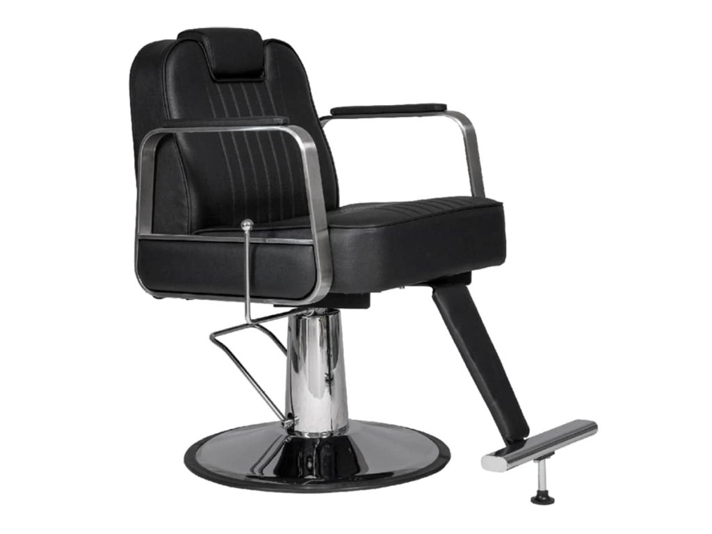Lacné barber kreslo LAYER s polstrovanými podrúčkami z nerezovej ocele v štýlovom prevedení dodá jedinečnú atmosféru každému barber shopu či holičstvu. Má sklopnú opierku chrbta, polohovateľnú opierku nôh a nastaviteľnú opierku hlavy. Skvelý pomer cena/kvalita.
