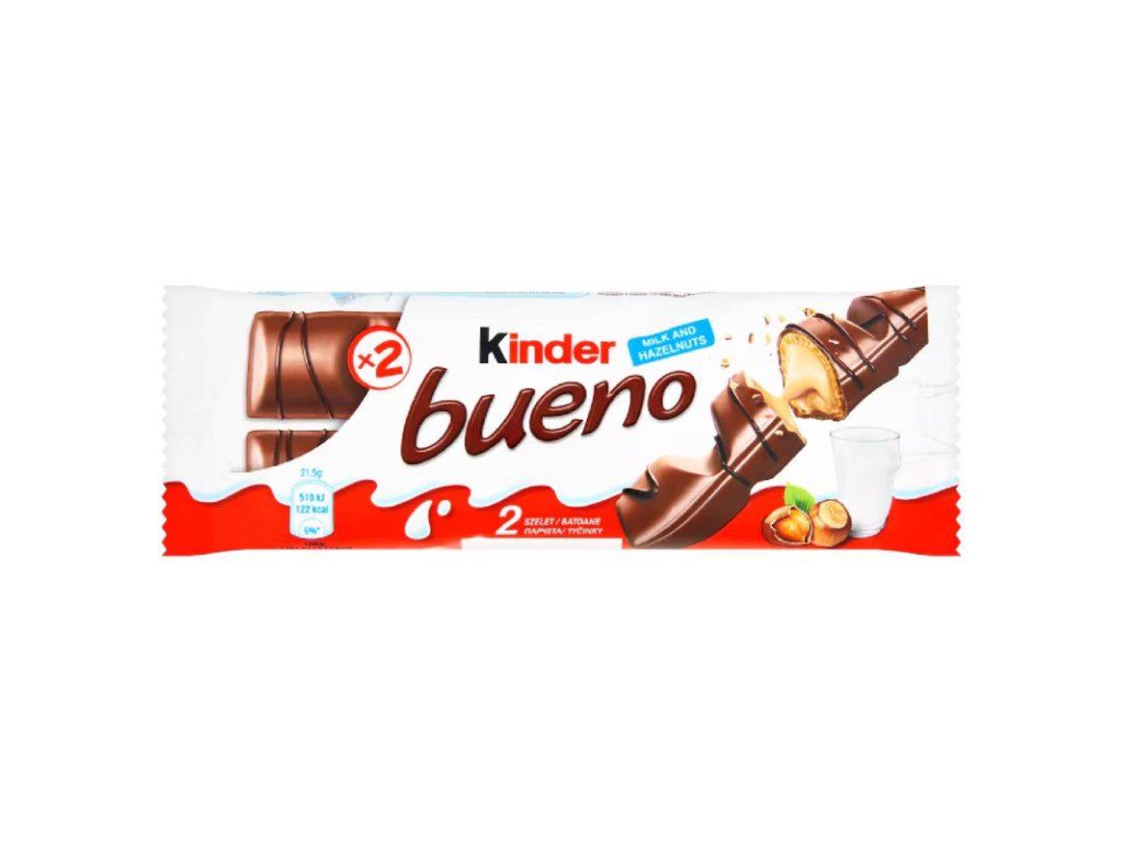 Kinder Bueno 43g Bueno je lahodná čokoládová tyčinka s nezabudnuteľnou chuťou. Každý kúsok, ktorý sa vám rozpustí v ústach, sľubuje potešenie v podobe lieskovo-orieškového krému, jemnej mliečnej čokolády a chrumkavej oblátky. Zloženie: Oblátky plnené mliečnou a lieskovcovou náplňou (54 %) v mliečnej čokoláde. Mliečna čokoláda 31,5 % (cukor, kakaové maslo, kakaová hmota, sušené odtučnené mlieko (11 %), bezvodý mliečny tuk, emulgátor: lecitíny (sójové); vanilín), cukor, palmový olej, pšeničná múka, lieskovce (10,8 %), sušené odtučnené mlieko (8,5 %), sušené plnotučné mlieko (5,5 %), jemná čokoláda 1,5 % (cukor, kakaová hmota, kakaové maslo, emulgátor: lecitíny (sójové); vanilín), kakaový prášok so zníženým množstvom tuku, emulgátor: lecitíny (sójové); kypriaca látka (hydrogenuhličitan sodný), jedlá soľ, vanilín. Obsah mliečnej sušiny: najmenej 19,5 % z celkovej hmotnosti. Informácie o alergénoch: Obsahuje: Lieskové oriešky, Mlieko, Sója, Pšenica Výživové údaje na 100 g: Energetická hodnota [kJ]: 2384 Energetická hodnota [kcal]: 572 Tuky [g]: 37,3 z toho nasýtené mastné kyseliny [g]: 17,3 Sacharidy [g]: 49,5 z toho cukry [g]: 41,2 Bielkoviny [g]: 8,6 Soľ [g]: 0,272 Skladovanie: Skladujte v suchu. Chráňte pred teplom a priamym zdrojom tepelného žiarenia. Cena je za bal./43g