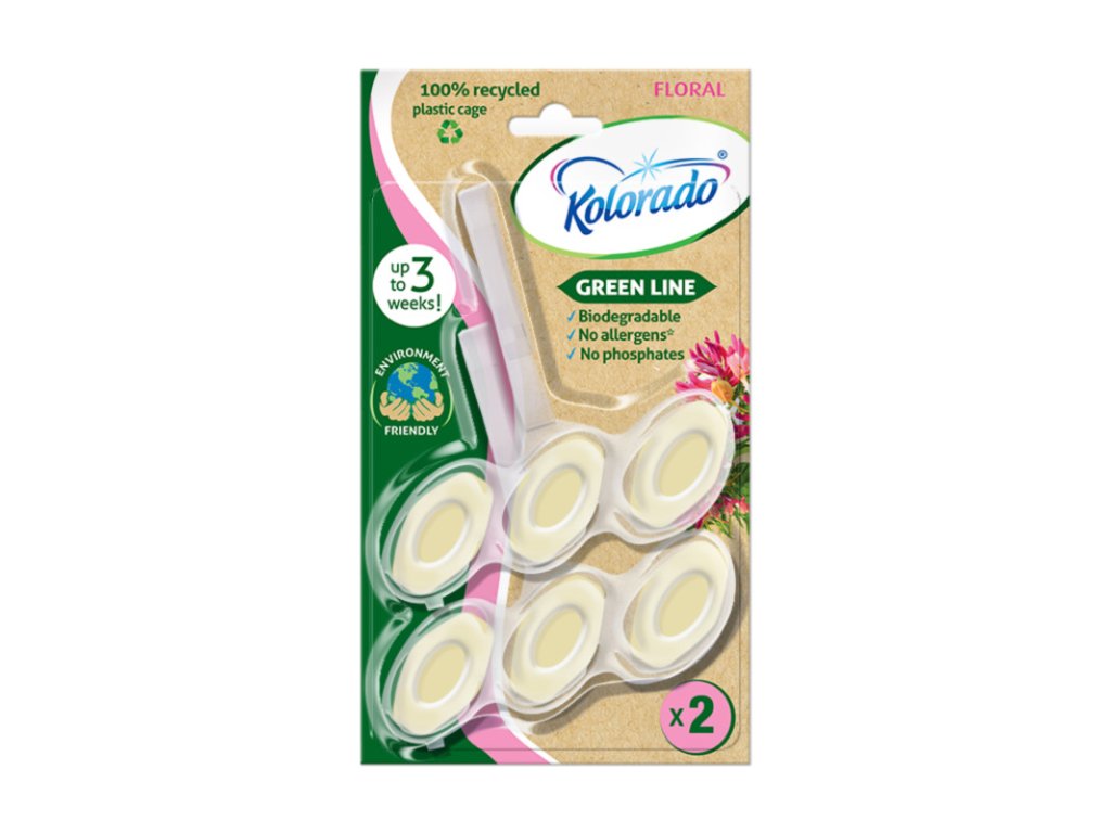 Kolorado Green Line WC blok duo pack FLORAL 2x 51g WC blok vôňa kvetov. Na rastúci záujem spotrebiteľov o produkty šetrné k životnému prostrediu je vyrobený tento WC blok, ktorý čo najmenej zasahuje do prírodného prostredia a zachováva základné funkcie WC blokov. Výhody produktu Biologicky odbúrateľný WC blok Bez obsahu fosfátov Bez alergénov (v množstve nad 0,01%) 100% recyklovaný plastový obal Balenie : 2x51g