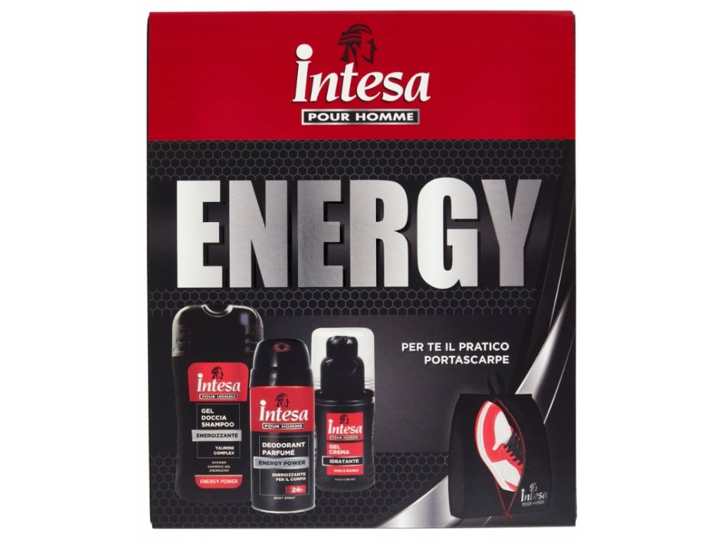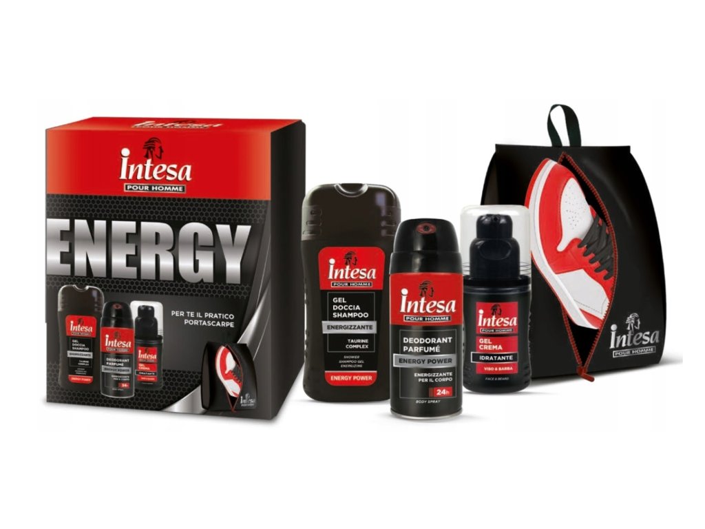 Kozmetický set INTESA POUR HOMME Energy - deodorant 150 ml + sprchový gél-šampón 250 ml + krémový gél na tvár 100 ml + taštička na topánky