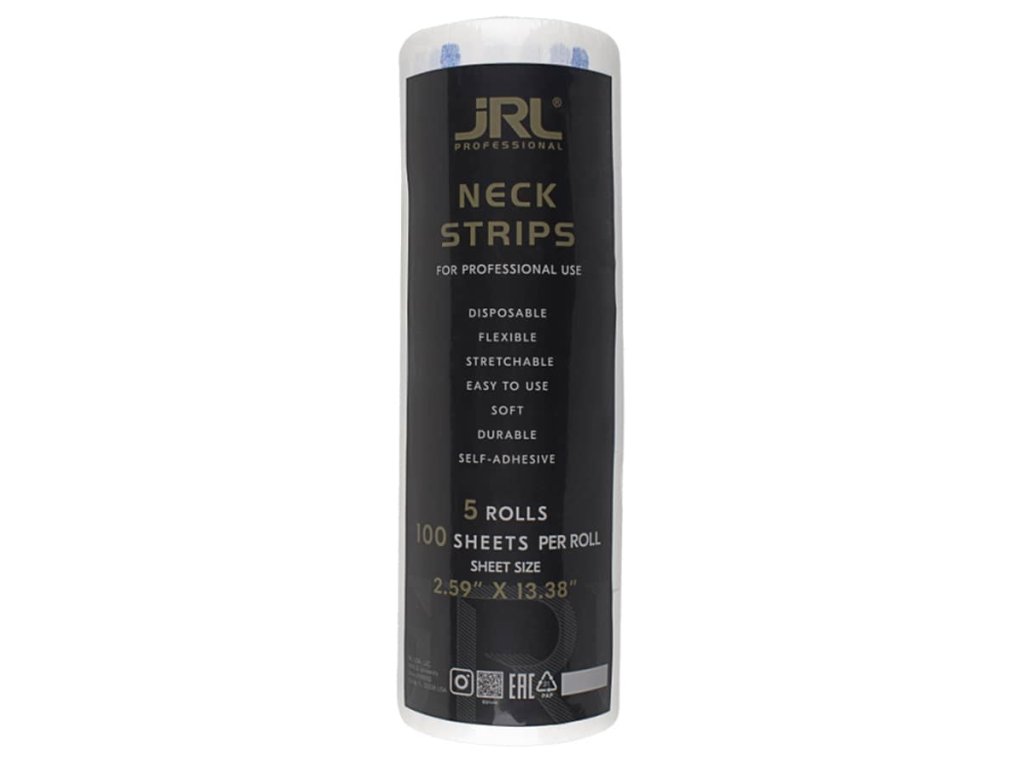 Biely barber papier na krk JRL je vyrobený z pružného a vysoko kvalitného materiálu, ktorý je odolný, mäkký a vodeodolný. V balení sa nachádza 5 rolí, každá rola obsahuje 100 límcov.