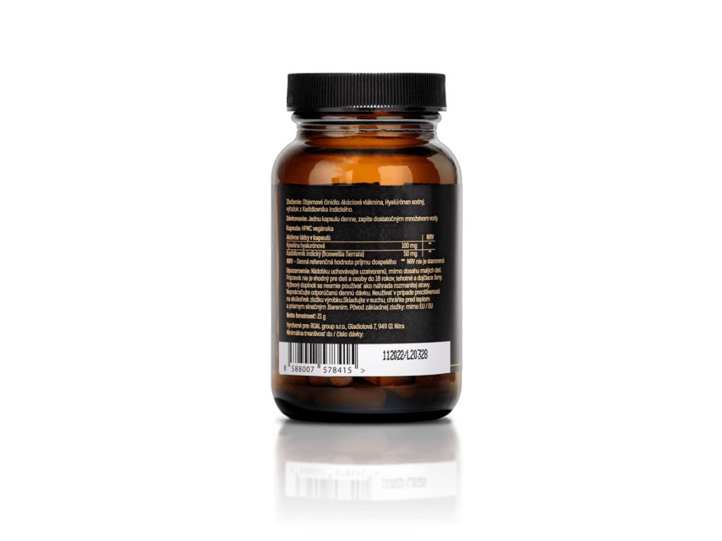 Kyselina hyalurónová ZEEN 60 kapsúl Výživový doplnok Kyselina hyalurónová od značky ZEEN by Roal podporuje vyživenie pokožky a jej mladší vzhľad, zlepšuje jej pevnosť a redukuje vrásky. Doplnok obsahuje kyselinu hyalurónovú a je obohatený o protizápalovú zložku Boswellia, balené vo vegánskych kapsliach. Tento jedinečný výrobok podporuje krásu a mladosť pokožky vďaka dokonalej hydratácii zvnútra. Boswellia je vzácny strom obsahujúci látky, ktoré podporujú pohybový systém a zlepšujú činnosť kĺbov. Pomáha pri artritíde, urýchľuje hojenie rán a posilňuje imunitný systém. Pomáha znižovať úzkosť a predchádzať vzniku autoimunitných chorôb. Prispieva k zlepšeniu metabolizmu svalov, hormonálnej rovnováhe a tým aj ku krajšej pokožke. Vlastnosti výživového doplnku Kyselina hyalurónová: podporuje pevnosť a elasticitu pleti, viaže na seba molekuly vody, ktoré vytvárajú hydratačné zásoby a hydratuje pokožku, podporuje pružnosť a vypnutie pokožky, redukuje vrásky, podporuje regeneráciu pokožky. Použitie Užívajte jednu kapsulu denne, zapite dostatočným množsvtom vody.Dodatočné parametre