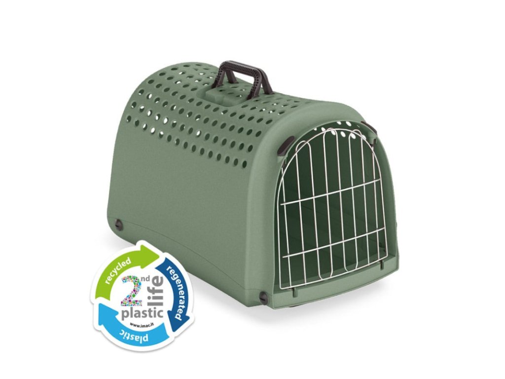 Plastová prepravka s kovovými dvierkami pre mačky.