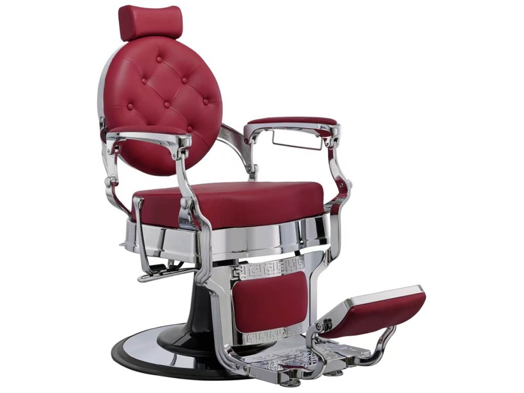 Luxusné barber kreslo BUZZ SILVER Burdeos spája pevnú hliníkovú konštrukciu, pohodlný sedák s penou a pružinami, obojstrannú podnožku a nastaviteľnú opierku hlavy. Strieborné detaily a elegantné vínovo červené čalúnenie dodajú barber shopu štýl aj autoritu.