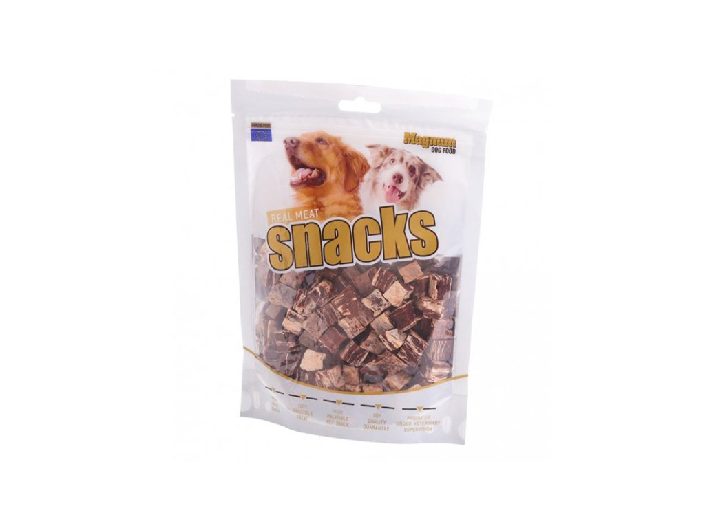 Magnum Dog Food Beef & Cod Cubes je pamlsok zo sušeného mäsa vhodné pre všetky plemená psov. Chutná a zdravá pochúťka zo skutočného mäsa. Obsahuje dva druhy živočíšnej zložky: hovädzie a treska.Dodatočné parametre