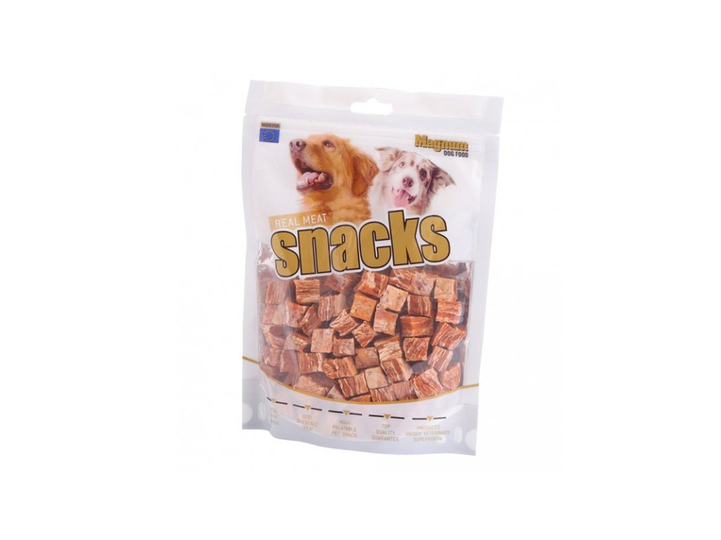 Magnum Dog Food Chicken & Cod Cubes je pamlsok zo sušeného mäsa vhodné pre všetky plemená psov. Chutná a zdravá pochúťka zo skutočného mäsa. Obsahuje jeden druh živočíšnej zložky: kura.Dodatočné parametre