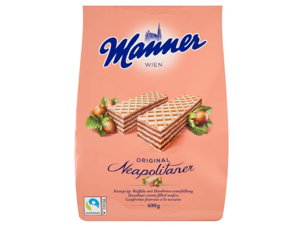 Manner Original Neapolitaner s orieškovou náplňou 400g Originálne neapolské oblátky Manner sú ružovou klasikou v srdci ponuky oblátok Manner – 5 chrumkavých a jemných oblátok so 4 vrstvami ľahkej a krémovej lieskovo-kakaovej plnky sľubuje výnimočnú chuť oblátok. Upečené podľa nezmenenej receptúry a len z tých najlepších surovín, garantujeme ten najlahodnejší chuťový zážitok s dlhoročnou kvalitou Manner. Praktické 400 g vrecko je ideálne na uvoľnené chvíle rozmaznávania doma alebo na spoločnú prestávku pri káve v práci. Originálne neapolské oblátky Manner boli vynájdené v roku 1898 zakladateľom spoločnosti Josefom Mannerom I. vo Viedni. Formát aj pôvodná receptúra zostali dodnes nezmenené. Sú Vyrábané v súlade so zásadami záruky kvality Manner a používajú výlučne kakaové bôby z trvalo udržateľných zdrojov, ktoré sa pražia priamo vo Viedni. Okrem toho sú originálne neapolské oblátky Manner vždy vegánske. Vlastnosti: 100% kakao FAIRTRADE Pražené vo Viedni Bez hydrogénových tukov Bez umelých prísad Originál Rakúska receptúra Zloženie: Cukor, Pšeničná múka, Rastlinné tuky (kokosový, palmový), Lieskové oriešky (12% v kréme), Kakaový prášok so zníženým množstvom tuku, Kypriaca látka: uhličitany sodné, Soľ, Emulgátor: sójový lecitín, Prírodná aróma. Informácie o alergénoch: Môže obsahovať iné orechy a mlieko. Výživové hodnoty na 100 g: Energia: 2038 kJ/485 kcal Tuk: 22 g z toho nasýtené mastné kyseliny: 13 g Sacharidy: 65 g z toho cukry: 46 g Bielkoviny: 5,6 g Soľ: 0,15 g Skladovanie: Skladujte pri izbovej teplote a na suchom mieste. Minimálna trvanlivosť do: viď zadná strana obalu. Cena je za bal./400g