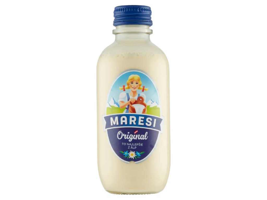 Maresi Original 250 g Maresi Original je nesladené kondenzované mlieko z rakúskych Álp. Kondenzácia je proces, pri ktorom sa odparí z mlieka voda a zdvojnásobí sa tak podiel bielkovín, mliečneho tuku a cukru. Maresi je prírodný produkt bez konzervantov, vhodný na priamu konzumáciu aj na varenie. Vďaka svojim kvalitám vydrží po otvorení až týždeň čerstvé a vďaka svojmu prírodnému obsahu a procesu výroby kondenzáciou, dodá aj malé množstvo mlieka Maresi vašej káve krásnu zlatohnedú farbu a jedinečnú karamelovú chuť. Na rozdiel od smotany, ktorá sa vyrába pridaním tuku, sa Maresi vyrába kondenzáciou, počas ktorej sa z mlieka odparí časť vody a tak sa v ňom zvýši obsah dôležitých živín. Z 1 litra plnotučného alpského mlieka získame 500g prírodného produktu bez konzervantov, aditív a samozrejme, bez genetických modifikácií. V zložení je len mlieko. Obsah tuku v zahustenom mlieku Maresi dosiahne prirodzenou metódou 7,5% a preto sa vynikajúco hodí aj na varenie. Každý dobrý kuchár by mal siahnuť po Maresi, pretože zvýšeným podielom bielkovín a mliečneho cukru, je v porovnaní s obyčajným mliekom obrovský rozdiel najmä v chuti a kvalite. A tak vzniká Maresi. Produkt, ktorý poteší nielen zmysly a chute, ale nesie so sebou aj cenné látky, prirodzenosť a vysokú kvalitu, tak prospešnú pre zdravie. Použitie: Do kávy : Ideálna dávka mlieka Maresi do kávy je 10 gramov. Teda presne jeden Maresi kalíšok dodá vašej káve krásnu zlatohnedú farbu a jedinečnú chuť. Do raňajok: Môžete si s ním uvariť pre vás a vašich najbližších puding, krupicovú kašu, mliečnu ryžu, wafle, palacinky, kakao alebo do müsli. Do polievok: Ak máte radi krémové polievky neváhajte vyskúšať MARESI pre zjemnenie ich chutí. Do príloh: Ak máte záujem pripraviť si ako prílohu k hlavnému jedlu pyré, môžete použiť MARESI, ktoré je hustejšie ako mlieko, ale jemnejšie ako smotana. Do dezertov: MARESI môžete dať do klasickej bublaniny, bábovky , či muffinov alebo z neho urobiť lahodný mliečny ovocný koktail. A najlepšia je z MARESI ľadová káva! Zloženie: Zahustené plnotučné mlieko nesladené, Množstvo tuku 7, 5%, Množstvo beztukovej mliečnej sušiny 16% Informácie o alergénoch: Obsahuje mlieko. Výživové hodnoty na 100 g: Energia: 520 kJ/125 kcal Tuk: 7,5 g z toho nasýtené mastné kyseliny: 4,7 g Sacharidy: 8,4 g z toho cukry: 8,4 g Bielkoviny: 5,9 g Soľ: 0,22 g Skladovanie: Skladujte pri izbovej teplote, chráňte pred priamym slnečným žiarením. Po otvorení uchovajte v chladničke a spotrebujte do 7 dní. Minimálna trvanlivosť do: viď hrdlo fľaše. Cena je za bal./250g