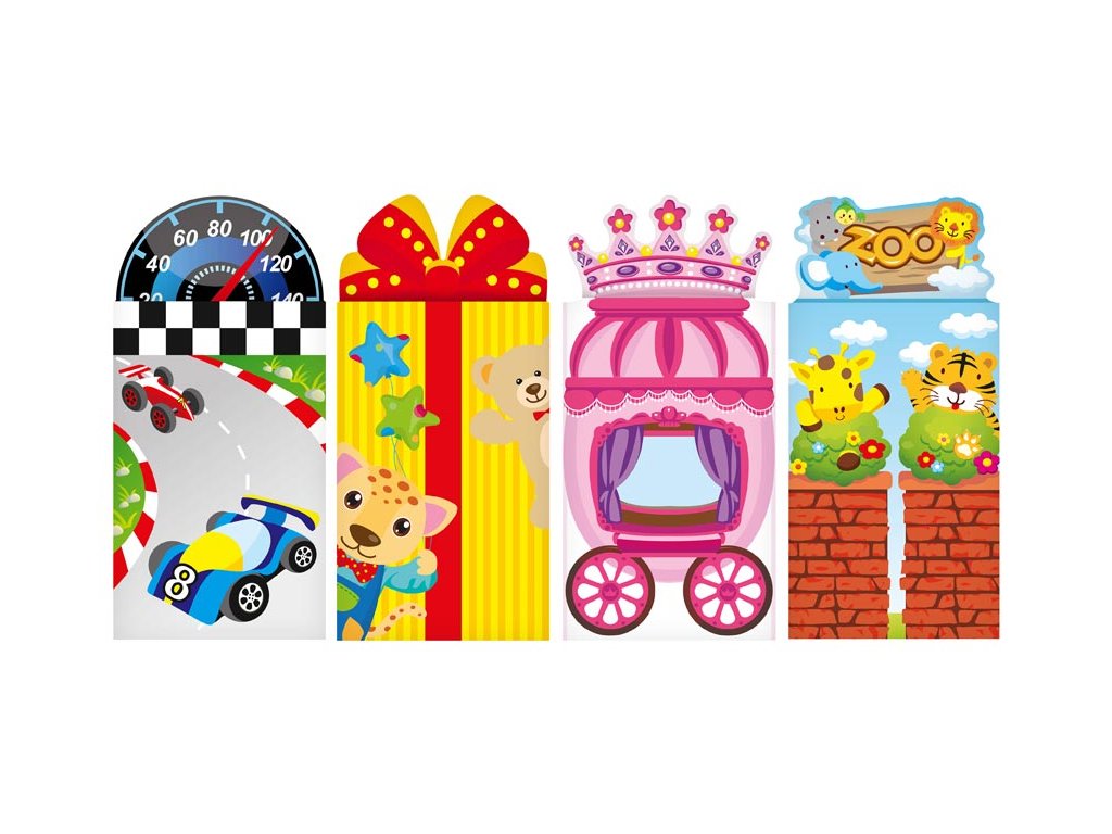 Samolepky 3D hrací set mix. Motív: formula, medvedíky, kočiar, zoo UPOZORNENIE: Nie je hračka, obal odstráňte z dosahu detí. Používajte pod dohľadom dospelej osoby. Dodávame v mixe 4 ks podľa skladovej zásoby. Uvedená cena je za 1 hárok.Dodatočné parametre