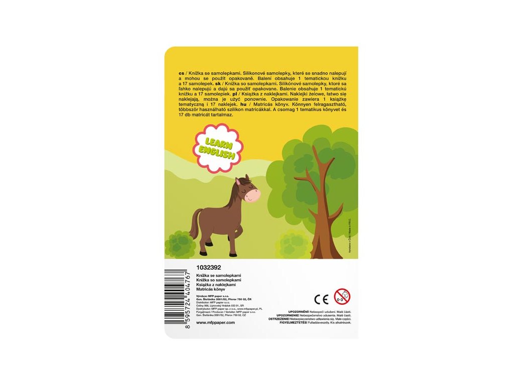 Vydajte sa s deťmi na dobrodružnú cestu plnú zábavy do sveta farmárskeho života! Kniha samolepiek z farmy je skvelým spoločníkom pre malých objaviteľov. Obsahuje 17 opakovane použiteľných samolepiek s rozkošnými motívmi - od veselého prasiatka, majestátneho koňa a usilovného farmára až po chutné plodiny, ako je mrkva a tekvica, a, samozrejme, traktor, ktorý všetko rozhýbe! Deti môžu samolepky umiestniť na pripravené obrysy alebo popustiť uzdu svojej fantázii a vytvoriť si vlastné príbehy na malebnej farme. Ideálne pre malé rúčky a veľké nápady! Motív: farma Rozmer: 120 x 180 mm VAROVANIE: Nevhodné pre deti do 3 rokov. Nebezpečenstvo vdýchnutia a prehltnutia malých častíc. Dodávame vo vrecku so závesom. Uvedená cena je za 1 ks.Dodatočné parametre