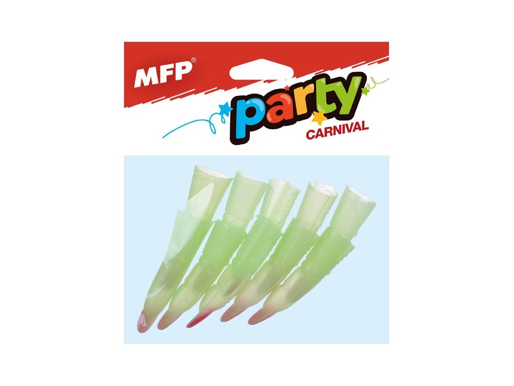 Doplnok ku karnevalovej maske – svietiace prsty. Ideálne na Halloween, maškarný ples alebo iné party. Prsty v tme svietia a váš kostým bude vyzerať hrôzostrašne. Sú vyrobené z plastu. Výrobok je zdravotne neškodný. Balený je v plastovom vrecku so závesom. Balenie obsahuje: 10 ks prstov Uvedená cena je za 1 balenie.Dodatočné parametre