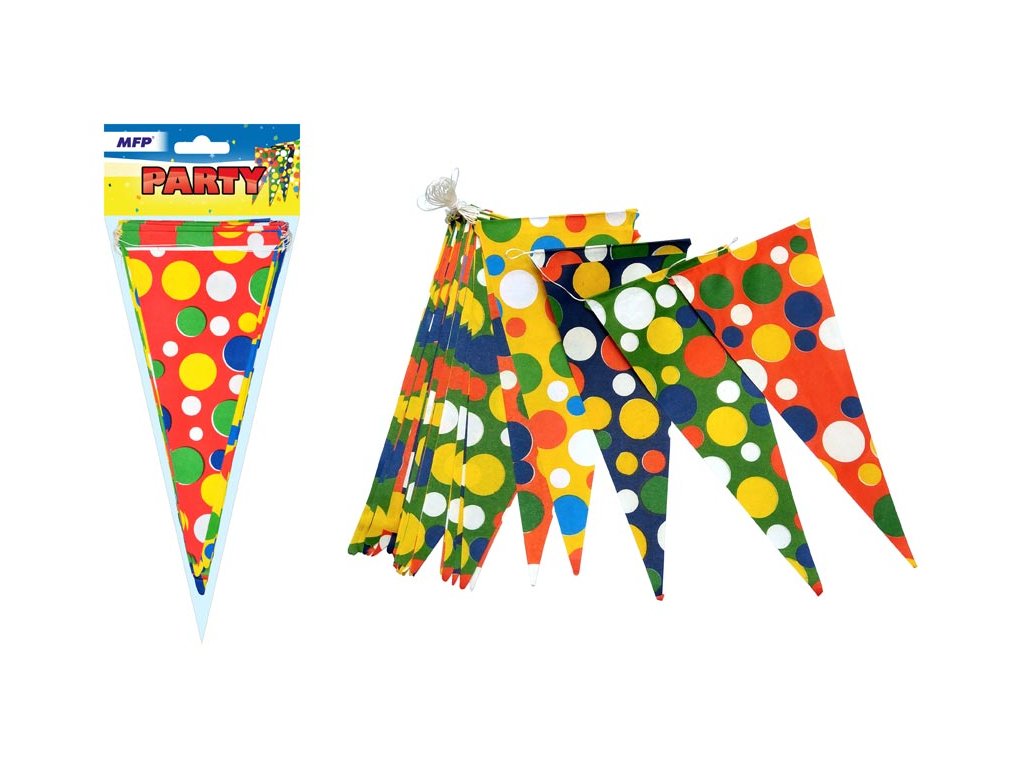 Papierová girlanda od spoločnosti MFP paper v tvare bodkovaných vlajočiek. Girlandy sú obľúbeným doplnkom na výzdobu miestností. Tuto girlandou nepokazíte dekoráciu na žiadnej párty, či sa už jedná o narodeninovú párty pre deti alebo pre dospelých. Zaručene upúta pozornosť všetkých zúčastnených. POUŽITIE: Pestrofarebné vlajočky sú spojené šnúrkou. Zaveste ich za oba konce cez celú miestnosť podľa vášho vkusu. Dĺžka: 10 m Dodávame vo vrecku so závesom. Uvedená cena je za 1 ks.Dodatočné parametre