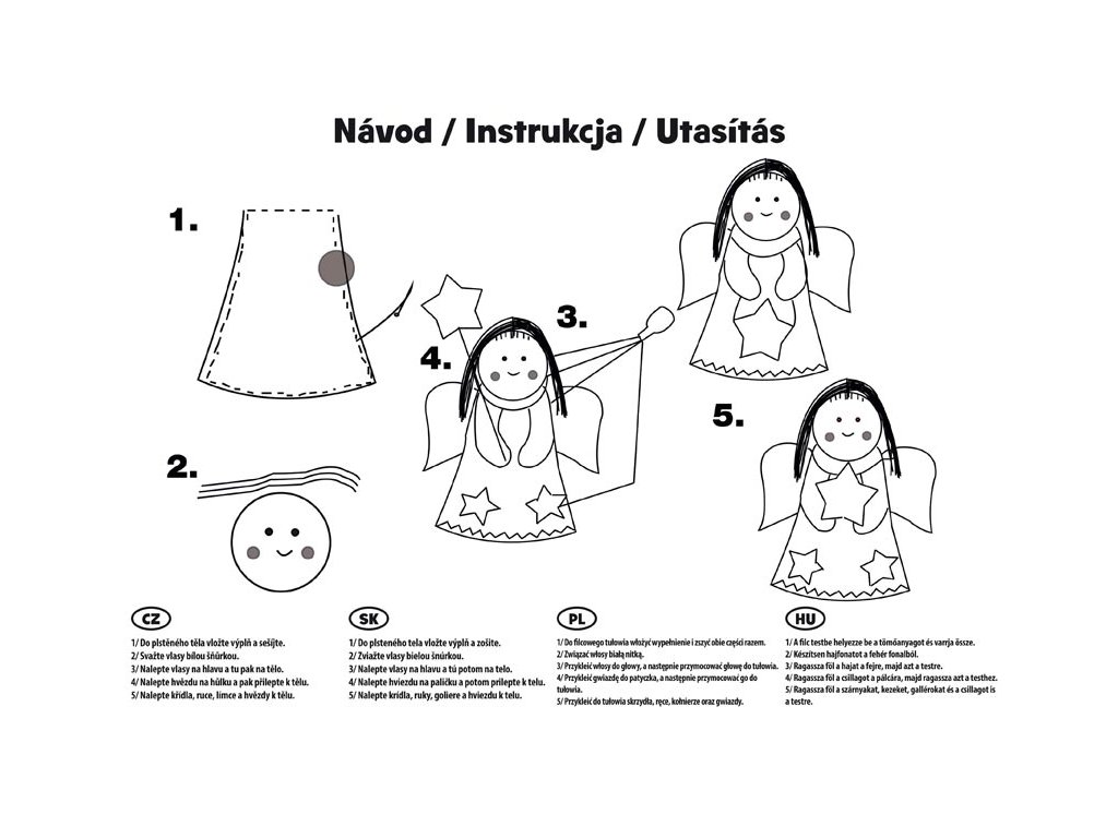 Kreatívna súprava Anjelik. Deti si precvičia svoje pršteky a rozvinú kreatívne myslenie. Jedno balenie obsahuje troch anjelikov. Každý kúsok bude originálny a jedinečný. Môžete si nimi len tak vyzdobiť byt, alebo sa s nimi môžu deti hrať. Všetko je zabalené v peknom darčekovom vrecku z recyklovateľného materiálu. Balenie obsahuje: plsť v tvare anjelikov (na 3 postavičky), stuhu, plstenú výplň, niť, návod NÁVOD: 1/ Do plsteného tela vložte výplň a zošite ho. 2/ Zviažte vlasy bielou šnúrkou. 3/ Nalepte vlasy na hlavu a hlavu na telo. 4/ Nalepte hviezdu na paličku a prilepte ju k telu. 5/ Nalepte krídla, ruky, goliere a hviezdy k telu. VAROVANIE: Používajte pod dozorom dospelej osoby, obal odstráňte z dosahu detí, nie je vhodné pre deti do 3 rokov, obsahuje malé časti, nebezpečenstvo prehltnutia a udusenia.Dodatočné parametre