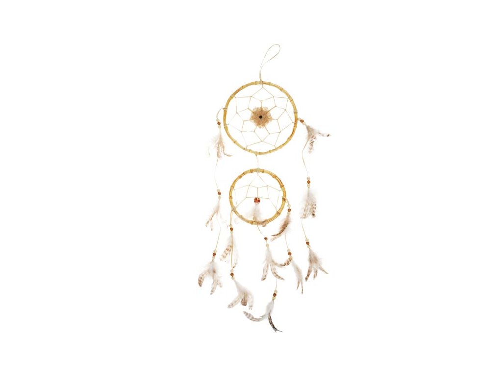Dekorácia lapač snov v bielej farbe. Lapač zavesíte voľne do miestnosti alebo nad posteľ, všetky nočné mory sa do neho zachytia a do rána budú razom preč. Lapač snov má dva kruhy (jeden menší a jeden väčší) a okolo nich je omotaný špagát. Z povrázku visí biela pierka s korálkami. Lapač má aj povrázok na zavesenie. Dodávame v sáčku so závesom. Uvedená cena je za 1 ks.Dodatočné parametre