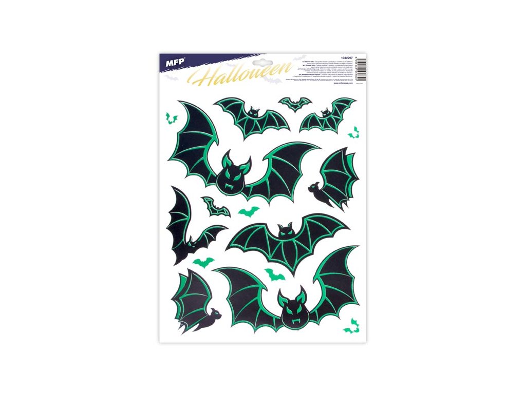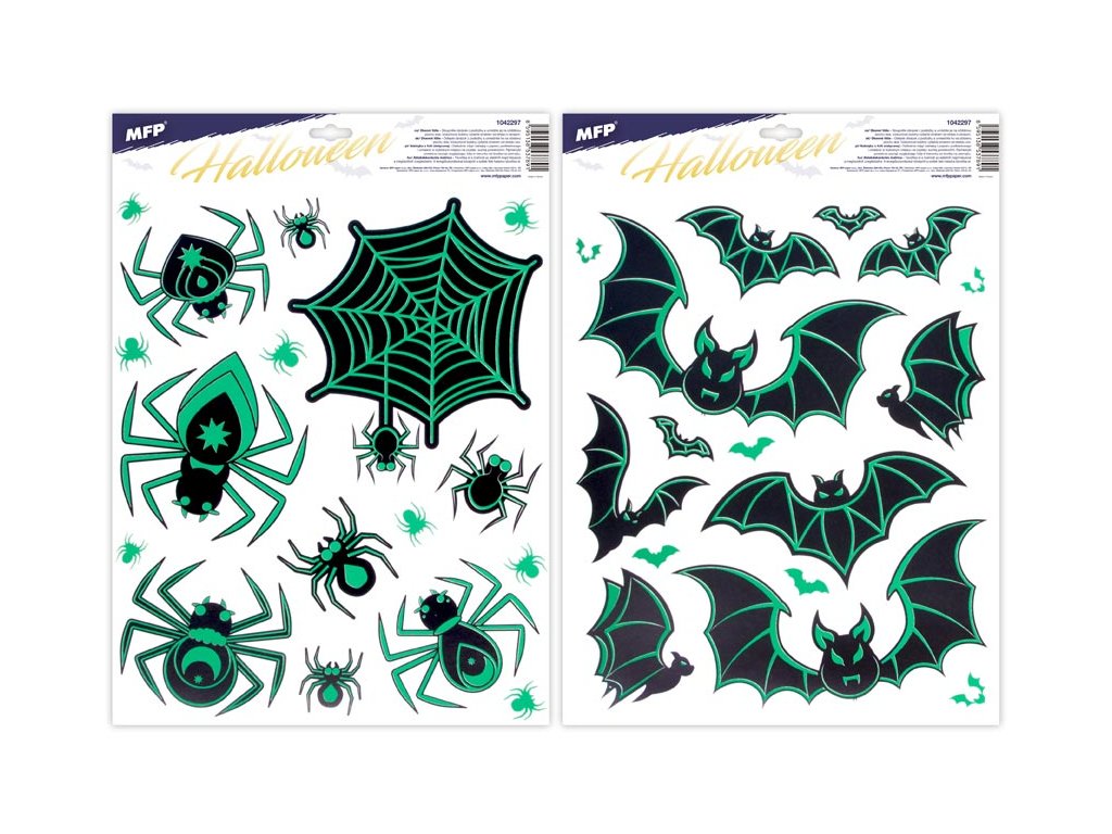 Okenná fólia svietiace Halloween s motívom pavúkov a netopierov. Vytvorí Vám tú pravú halloweensku atmosféru. Vhodné sú na akékoľvek hladké plochy, napríklad sklo, výlohy, zrkadlá alebo kachličky. Čisté, bez lepidla a opakovane použiteľné. NÁVOD: 1. Zlúpnite z podložky obrázok a umiestnite na čisté, prípadne navlhčené sklo stranou, ktorá bola na podložke. 2. Obrázok elektrostaticky priľne. 3. Fólia sa ľahko zlúpne a dá sa premiestniť. Dodávame v mixe po 2 ks podľa skladovej zásoby. Uvedená cena je za 1 ks.Dodatočné parametre