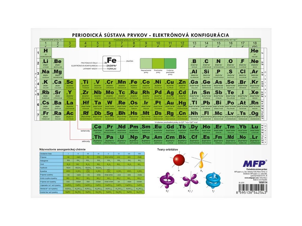 Periodická tabuľka prvkov veľkosti A4 - výuková tabuľka. Vhodný doplnok k výučbe chémie na základných a stredných školách. Periodická sústava prvkov obsahuje: - chemickú značku prvku - český a latinský názov - oxidačné číslo - elektronegativitu - protónové číslo - hmotnostné číslo - elektrónovú konfiguráciu Prvky sú rozdelené do skupín: - rádioaktívne prvky - alkalické kovy - kovy alkalických zemín - kovy, polokovy, nekovy - vzácne plyny Uvedená cena je za 1 ks.Dodatočné parametre